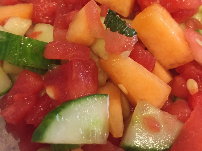 - Use a sharp knife and cutting board to slice and dice the cucumbers into bite size pieces (in the photos I left the skin on so you could see the difference in the honeydew and cucumber – I highly recommend skinning the cucumber. It goes better with the rest of the fruit that way.).